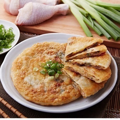 大成酥嫩雞肉香蔥薄餅 雞腿肉內餡鹹香鮮甜,融合青蔥清爽解膩 餅皮越嚼越香